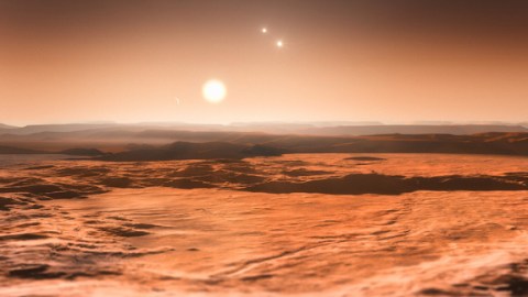 The image above is an artist’s impression of what it might look like to live on the exoplanet Gliese 667Cd, one of three super-Earths discovered in the habitable zone of the nearby star Gliese 667C. A total of six, and maybe even seven planets orbit this star, which is 22 light-years from Earth.