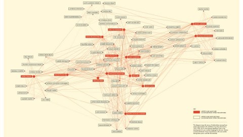 [Image: The invention of abstraction was not the inspiration of a solitary protagonist, but a relay of ideas that moved through a network of artists and intellectuals working in different countries and different media. This diagram maps the nexus of relationships among those artists represented in the exhibition Inventing Abstraction: 1910-1925, all of whom played a significant role in the development of a new modern language for the arts. Vectors connect individuals whose acquaintance with one another in the period 1910-1925 could be documented. The names in red represent those figures with the most number of connections within this group. The chart was a collaboration among the exhibition’s curatorial and design team and Paul Ingram, Kravis Professor of Business, and Mitali Banerjee, doctoral candidate, Columbia Business School. An interactive online version of this diagram can be found here.]
