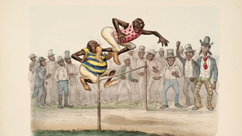 [Image:Currier and Ives. Detail of lithographic print from the Darktown Series, 1882-1893. Caption: “Darktown Athletics—A Running High Jump. Match between the darktown grasshopper and the blackville frog.” These hand-colored lithographs are part of a series created by Currier and Ives called the Darktown Series. The company made the prints between 1879 and 1893. With over 100 scenes in the theme, it was among the most popular and best-selling series that Currier and Ives produced.]