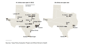 Fast-forward 21 years to 2013, when Texas passed House Bill 2. By establishing upgrade requirements and a new rule that physicians performing abortions must have admitting privileges at a local hospital, the law shuttered many of Texas’s abortion facilities, leaving “fewer than a dozen clinics across its more than 267,000 square miles.” For women in El Paso or other western parts of the state, this meant an abortion was more than a 500-mile drive away. Here is how The New York Times depicted the change: