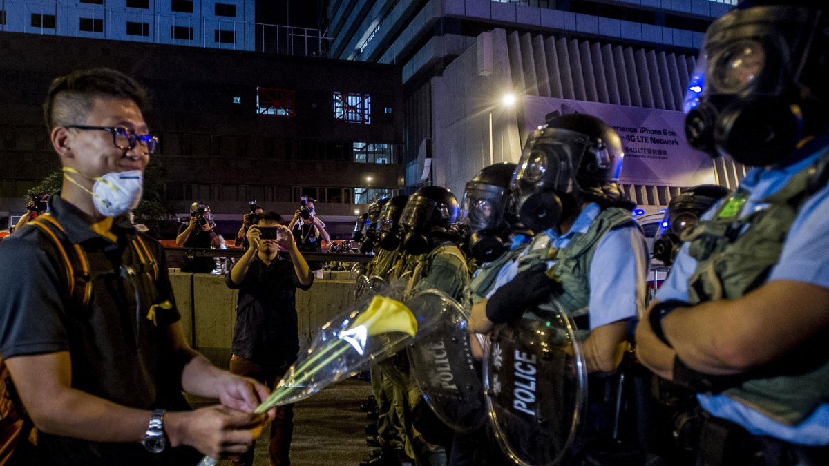 Image Credit: XAUME OLLEROS / Stringer. A demonstrator offers a flower to riot policemen during a pro-democracy protest in Hong Kong on September 28, 2014. Police fired tear gas as tens of thousands of pro-democracy demonstrators brought parts of central Hong Kong to a standstill.