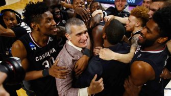 Head coach Frank Martin of the South Carolina Gamecocks celebrates with players after defeating the Duke Blue Devils 88-81 in the second round of the 2017 NCAA Men’s Basketball Tournament at Bon Secours Wellness Arena on March 19, 2017 in Greenville, South Carolina. (Photo by Gregory Shamus/Getty Images)