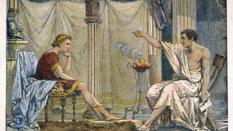 Aristotle teaching Alexander the Great. Engraving by Charles Laplante [Public domain], via Wikimedia Commons