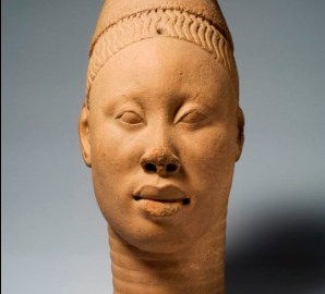 [Image: Head called “Lajuwa.” Ife Palace, Ife. 12th-15th century C.E. Terra-cotta. © National Commission for Museums and Monuments, Nigeria. Photo Courtesy Museum for African Art/Fundacion Marcelino Botin. (Photo: Karin L. Willis.)]