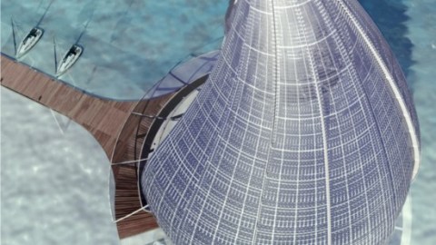 The image of a design by the Orlando de Urrutia Architectural Firm in Spain. The hotel is shaped like a drop of water and might sit on a dock extended over the sea as in these drawings.