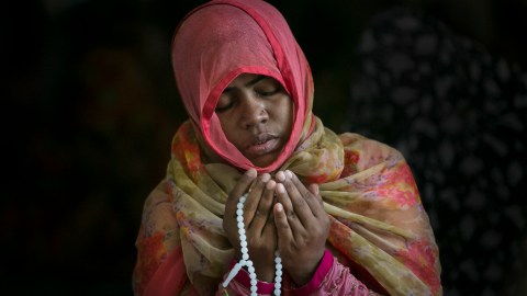 A woman cries as she prays on the first day of Ramadan on May 18, 2018 in Dhaka, Bangladesh. (Photo by Allison Joyce/Getty Images)