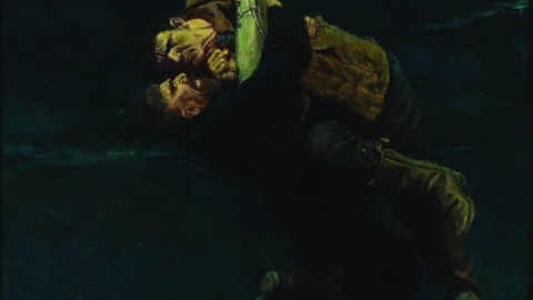 [Image: He lost his hold and fell, taking me with him, 1909, from “The Grain Ship, by Morgan Robertson, in Harper’s Monthly Magazine, March 1909. Howard Pyle (1853-1911). Oil on canvas, 27 1/2 x 17 7/8 inches. Museum Purchase, 1912.]