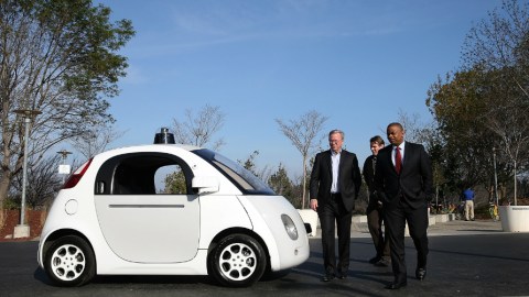 Photo: MOUNTAIN VIEW, CA – FEBRUARY 02: U.S. Transportation Secretary Anthony Foxx (R) and Google Chairman Eric Schmidt (L) walk around a Google self-driving car at the Google headquarters on February 2, 2015 in Mountain View, California. U.S. Transportation Secretary Anthony Foxx joined Google Chairman Eric Schmidt for a fireside chat where he unveiled Beyond Traffic, a new analysis from the U.S. Department of Transportation that anticipates the trends and choices facing our transportation system over the next three decades. (Photo by Justin Sullivan/Getty Images)