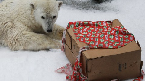 A Polar Bear named Pike prepares to open a gift box while playing in freshly blown snow at the San Francisco Zoo. Photo by Justin Sullivan/Getty Images)