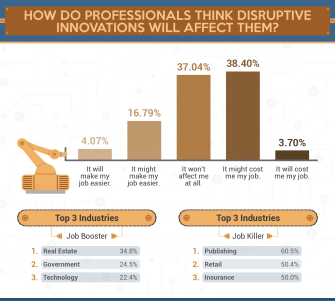 Industries that have been rocked by disruption, such as publishing and retail, have a higher percentage of professionals that fear being replaced. Retailers, for example, have struggled with consumers who browse in physical showrooms while buying the product cheaper online. It is hard to have the lowest price as a retailer when you have significant overhead. Amazon’s push towards quicker times from checkout-to-doorstep, such as through drones, will only add greater pressure on brick-and-mortar retail.