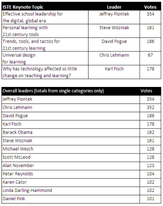 Here is the current leaderboard for the ISTE conference keynote crowdsourcing project. As you can see, there’s been a shakeup at the top. Jeffrey Piontek is now slightly ahead of Chris Lehmann (if you don’t count Chris’ votes in the Universal Design for Learning category). Other folks who have moved up the charts quickly over the past 24 hours include Karen Cator and Alan November.