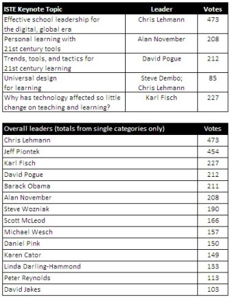 Here is the current leaderboard for the ISTE conference keynote crowdsourcing project. Chris Lehmann has retaken the lead over Jeff Piontek.