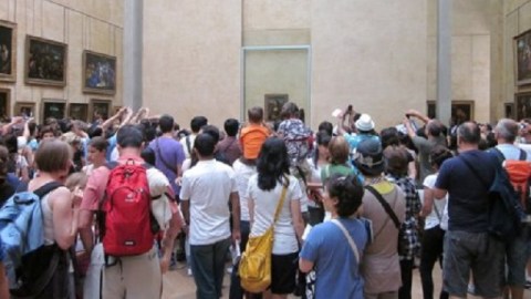 I can understand the frustration. The most underwhelming art experience of my life was coming face to face with the da Vinci’s Mona Lisa at the Louvre. Curators had just moved the “greatest painting of all time” to a new, allegedly more crowd-friendly location. My wife and I stood for 15 minutes in a kind of cattle shoot, slowly edging closer and closer to the tiny masterpiece as the humanity pressed in around us and flashbulbs popped incessantly (similar to the scene shown above). By the time we had slogged to the front for some face time, we had experienced a degree of boxing I’d not seen since Moses Malone retired. The stress of getting to that point robbed the experience of much of the pleasure. We escaped to a nearby hallway and enjoyed much more several other, less famous works by Leonardo in relative freedom.