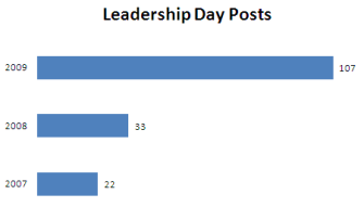 Last year I intended to individually summarize and link to everyone’s posts (like I had in years past), but I was wholly unprepared for the sheer volume of participation in Leadership Day 2009 (see graph below). I apologize to everyone for not doing what I had done in previous years. I am extremely grateful to Karen McMillan and Dennis Richards, who together did the bulk of the aggregation of the posts that are listed in the 2009 summary spreadsheet above. That list would not exist without them. I think I’ve got a much better system now, so I hope my struggles last year won’t be a barrier to your participation in this year’s event. We’d love to have your perspective!