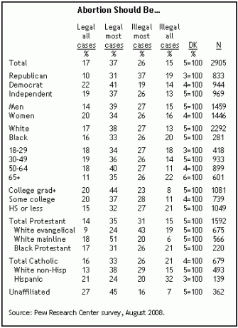 “Which comes closest to your view on abortion: abortion should always be legal (25% support); should be legal most of the time (24% support); should be made illegal except in cases of rape , incest and to save the mother’s life (37%); or abortion should be made illegal without any exceptions? (10%)”
