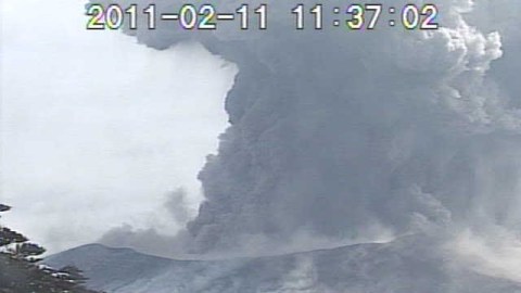 Top left: Webcam capture by Eruptions reader Raving of an explosive eruption at Kirishima on February 11, 2011.