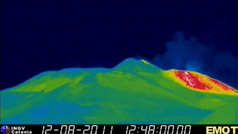 Top left: A thermal image of Etna as seen on August 12, 2011. The new Southeast Crater is the red area on the right side of the image.