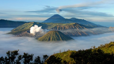 Top left: An undated image of Bromo (steaming crater in foreground) and Semeru (background) in the Tengger Caldera, Indonesia