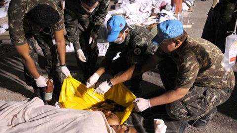 So far some 333000 people have received emergency shelter material, such as plastic sheeting, with over 230000 tarpaulins and 22000 tents being distributed. Remarkably there have been no outbreaks of serious disease, and up until February 20 over 12500 thousand tons of rice had been distributed to over 2.9 million people. And here is a snapshot of the activities of MINUSTAH, the UN peacekeepers, who have succeeded in doing what many of the gainsayers said, could not be possible – keep the peace in truly extraordinary circumstances. Over one day, February 21-22, some 1,778 multinational troops conducted 288 vehicle and foot security patrols in Port au Prince, with seventy troops providing escorts for five major humanitarian food distributions. And elsewhere on that same day, the UN Police, working with the shattered remnants of the Haitian police conducted 150 joint patrols in Port au Prince, with 44 police checkpoints being established.