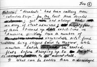 What’s fascinating about Nabokov’s new book, of course, is that you actually see all of Nabokov’s words as they appear on his notecards – complete with smudges, cross-outs, words scrawled out in Russian and French (he was trilingual) and annotated notes to himself about titles of chapters and key points he wants to make about his characters. There’s one page of the book that’s a full-on discussion of the precise word that Nabokov would like to describe a female character (fille, in French) and how best to render that word in English, while keeping the connotations and meaning of the word in French. If you’re a scholar of Russian literature or a huge Nabokov fan, it’s a real treat to see the internal gearings of his mind at work.