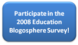 Just two days left to complete the 2008 Education Blogosphere Survey. We’re currently at 382 participants. Absent a last-minute deluge of responses, I don’t think we’ll make my revised goal of 500 respondents, but maybe we can tip over 400!