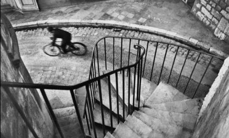 The MoMA divides the images into twelve sections—a few chronological for the sake of coherence, but the rest thematic for the sake of understanding. Cartier-Bresson leapt over time with his camera, paradoxically arresting movement in the name of keeping it going forever. These photos, Galassi extols, “celebrate motion by freezing it exquisitely: the heel of the leaping man behind the Gare Saint-Lazare will never touch its watery reflection; the cyclist in Hyères will forever streak past the uncoiling staircase” (image above). Like the Grecian Urn in Keats’ Ode, these figures will be “For ever warm and still to be enjoy’d,/For ever panting, and for ever young;/ All breathing human passion far above.” Cartier-Bresson’s art hovers above all breathing human passion doomed to breath its last someday and, instead, gives us life forever young, forever moving, and forever alive in its arrested development.