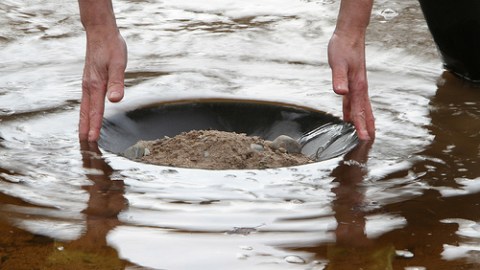 Time to pan. I make an upturned bucket into a makeshift stool and begin gathering gravel and loose stones from the deeper pockets in the riverbed that I run through a separator to weed out the larger stones. Then I dump handfuls of this into my pan and begin the panning process, dipping the pan into the running water and gently moving the pan from side to side to encourage (in theory) the gold flakes to settle in the bottom of the pan where they will be used to fund the purchase of a small island in the Caribbean. In theory.