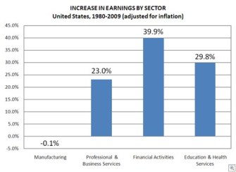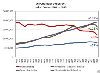 The second chart shows the average increase in real earnings since 1980, broken out by labor supersector and adjusted for inflation. As you can see, not only are manufacturing jobs disappearing, those that are left actually have seen a decline in inflation-adjusted earnings over the past three decades. In other words, the purchasing power of your average manufacturing employee is less than it was three decades ago. Not so for the other three supersectors in the chart. I’m no workforce expert but this doesn’t seem to make a strong argument for the manufacturing industry here in America until our companies figure out how to effectively navigate overseas competition despite higher wages, corporate health care and other legacy costs, Americans’ expectations regarding standard of living, and other issues.