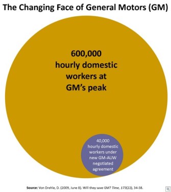 As many of you know, GM has been in the news lately as it faces possible bankruptcy proceedings. The image below shows the shrinkage of GM’s workforce over a generation.