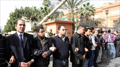 Very soon into the revolt, the Egyptian government took the drastic step of shutting down access to information and communications systems (save landlines). As of this writing, reports are that all access to servers and mobile phones have been shut down, as well. Rather than inhibit protest, this has coincided with and may have added impetus for a swelling of protest, with people gathering en masse in the hundreds and thousands. (The extent to which this is a tech or a social media revolution has been debated by commentators for days– and will continue to be so. But similarly to what I’ve written before, for the moment this argument, while worth studying in the abstract, is besides the point.) This fight is playing out on the streets. The protesters are fighting no matter which technologies are available, willing to put themselves at risk to protect what is important to them. And one of the things they took to the streets to protect was their museums.