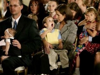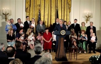 So yesterday, in a White House press conference televised live on the cable news networks, Bush appeared in a packed room of families with children who were adopted as so-called left over embryos from IVF clinics. Also in the room were patients who had been treated with adult stem cell therapies. With the sounds of kids in the background, and a boisterous and supportive audience, the press conference was a stunning success, and the photos that ran on the news wires and that were picked up in today’s newspapers support my judgment. These images immediately re-define the debate over research on left over embryos as really about research on human lives, “young humans” as Senator Sam Brownback repeats over and over again.