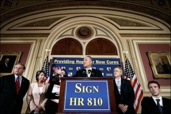 I’m sorting through all the news coverage this week, and will be having posts forthcoming summarizing the major frames and narratives that appeared in Editorials, Op-Eds, soundbites, and news coverage, but to start, the most stunning outcome from yesterday’s veto was to witness the clear dominance that Bush & Co. displayed when it came to visual framing. The battle over visuals is important. While the press tends to contextualize the issue and is more favorable ground for getting pro-research interpretations into coverage, the majority of Americans are going to rely on TV reports, headlines, and newspaper/online photos for their impressions.
