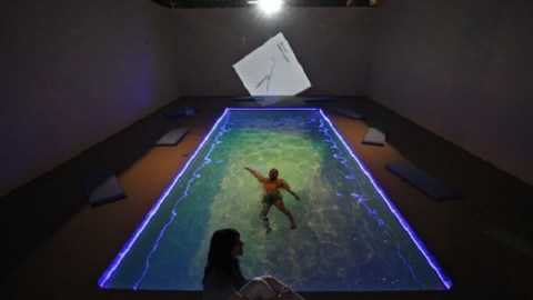 By contrast, Oiticica and D’Almeida’s swimming pool asks only that you take a dip. A lifeguard on duty supplies the towels and disposable swimming suits can be purchased in the museum shop. CC4 Nocagions belongs to a larger series called Cosmococas, with the “cocas” referring to cocaine—the narcotic bane of Latin (and North) American existence. The collaborating pair allegedly indulged in the white powder while conceiving the swimming pool idea. In the room in which the pool resides, images from minimalist composer John Cage‘s book Notations appear projected on the walls, but with white lines of cocaine traced on them by D’Almeida. Blue rope lights on the side of the pool and an eerie green light dancing upon the water complete the scene.