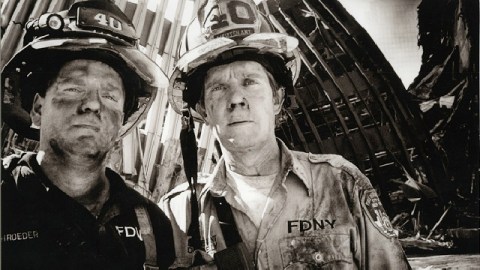 The photos of A Second Telling strike more elegiac and honorific notes than the mix of horror and aesthetic perfection in The Falling Man. Christophe Agou’s photo of the twisted metal framework of Ground Zero as seen through a shattered window frame transformed into an ad hoc cross will make you see the site as a mass grave, as hallowed ground watched over by a mourning deity. (Or, to play Devil’s advocate, it will make you wonder how a just and loving God could have allowed such evil to occur.) Mark Selliger’s photo (shown above) of two firefighters—proud and resolute faces covered in soot—standing tall with the wreckage behind them redefines the meaning of “twin towers.” Selliger celebrates the simple pride of these first responders in their city, their country, and their job and challenges us to respond with anything less than gratitude and amazement.