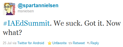 The backchannel on Twitter was phenomenal. I have the very naive wish that Iowa policymakers would spend some time going through the tweets. The backchannel conversation was witty, passionate, insightful, both challenging AND supportive, and, most of all, real. Whatever political points were being attempted on stage were dissected in depth and filtered through the honest reality of learning, teaching, and living in Iowa. The very best barometers of how crowd members were receiving the intended message(s) were the tweets at #iaedsummit.