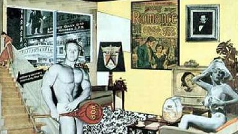 Pop Art popped up around the world in various guises generally after the end of World War II. The “peace dividend,” only slightly offset by the cost of the simmering Cold War, led to a proliferation of commercial advertising that continues to this day. Swimming in this sea of commercialism, Hamilton, a devotee of Dada and Surrealism and, above all else, an acolyte of Duchamp, took the lessons of those movements and applied them to life in the mid-1950s. Just what is it that makes today’s homes so different, so appealing? literally elevates kitsch to high art, as symbolized by the framed comic book cover against the wall. The body builder on the left and naked woman on the right embody the commodification of the human form into just another business transaction—something to be marketed to relentlessly, idealized in the name of selling deodorant and toothpaste. The collage collects all the ideas of pre-World War II anti-establishment art and updates them for the very different post-war world.