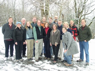 Members of the Columbia River Quorum (March 2009): Back row: Bob Frodeman, Scott Sanders, Steve Vanderheiden, Andreas Schmittner, Hank Green, Fred Swanson, Charles Goodrich, Kathie Olsen, John Bliss, Mark Hixon. Front row: Kathy Moore, Carly Johnson, Michael Nelson, Pam Sturner, Alison Deming, Michaela Hammer. Missing: Eban Goodstein and Matt Nisbet.