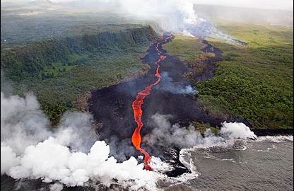 Top left: A 2007 lava flow from Piton de la Fournaise reaching the ocean. Note the active lava channel is only a fraction of the flow field, suggesting the lava flow meanders like a river before defining a clear flow channel.