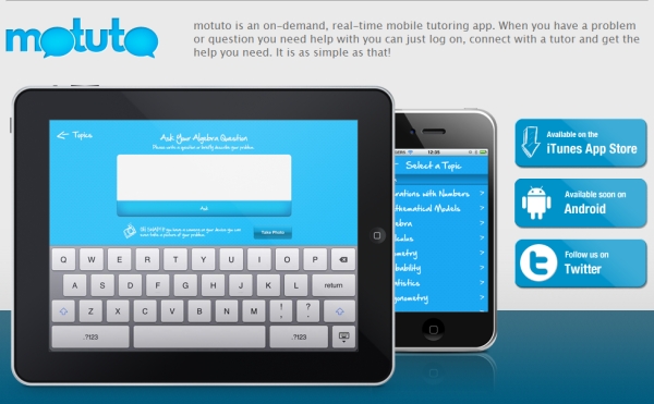 Today, all the student needs is an iPhone or iPad 2. He loads the Motuto app, takes a picture of the problem he needs to solve and then gets instantly connected with a real, flesh and bone tutor. Within the app the student will be able to chat with the tutor and to use a collaborative whiteboard in order to solve the problem. The tutor is trained to not give the answer but to assist the student in getting the right answer on his own.