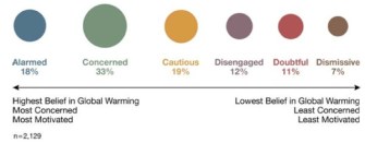 Last summer, joined by outstanding graduate students from AU and GMU, we conducted approximately hour-long open-ended interviews with 70 subjects recruited on the National Mall, at a rural Maryland outlet mall, and over the phone. We were looking for respondents who lived at least 1 hour outside of the Washington, DC area. (In all, our final respondent pool represented 29 states.)Using a short screening survey, we categorized subjects in terms of 6 previously identified audience segments on climate change. These six segments of Americans – the Alarmed (18% of the adult population), the Concerned (33%), the Cautious (19%), the Disengaged (12%), the Doubtful (11%), and the Dismissive (7%) – fall along a continuum from those who are engaged on the issue and looking for ways to take appropriate actions (the Alarmed) to those who actively deny its reality and are looking for ways to oppose societal action (See below and the Six Americas of Global Warming report.)