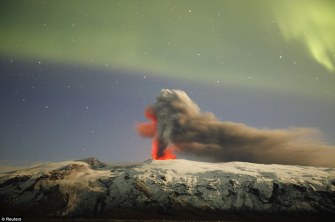 nA night shot of the Eyjafjallajökull eruption showing the glowing plume from the strombolian explosions and the Aurora Borealis overhead.