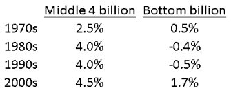 Below is a graph of the growth rates of the bottom five billion over the past few decades [note that the actual growth rates were not this linear; Collier reported his figures by decades so I had to approximate]. Growth rates were as follows: