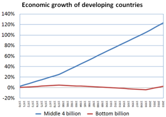 In contrast, the bottom billion people continue to live in ‘??the fourteenth century, [doomed by] civil war, plague, and ignorance’?? (p. 3). Their economies are not growing and, ‘??given the power of compound growth rates, [the] differences between the bottom billion and the rest of the developing world will rapidly cumulate into two different worlds’?? (p. 10). The bottom billion not only are ‘??falling behind … [they are] falling apart’?? (p. 3).