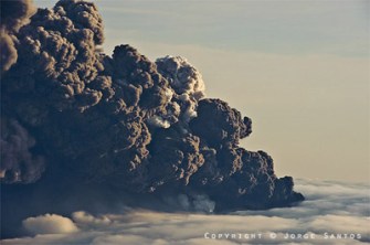 nA shot of the grey and white plume from the Eyjafjallajökull eruption on April 14, 2010. Image courtesy of (and copyright) Jorge Santos.