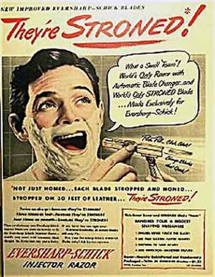 times the speed of sound?). For the past 50 to 60 years, in fact, the razor blade industry has always operated under this assumption — that rapid, technological innovation with razor blades is the way to go. Referencing this 1948 vintage shaving advertisement, Corey Greenberg of the Shave Blog weighs in: