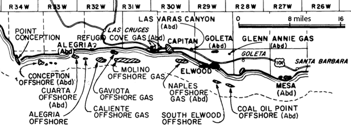 What else do we have near Santa Barbara? Lots of oil and other hydrocarbon deposits in the Monterey Formation, that is what! The area is littered with hydrocarbons that are actively worked – the offshore oil rigs are evidence of that. About 15 miles to the south of Santa Barbara you actually find “tar pits” as well, places where hydrocarbons ooze to the surface. These are the Carpinteria Tar Pits, the lesser-known cousin to the famous La Brea Tar Pits in Los Angeles.