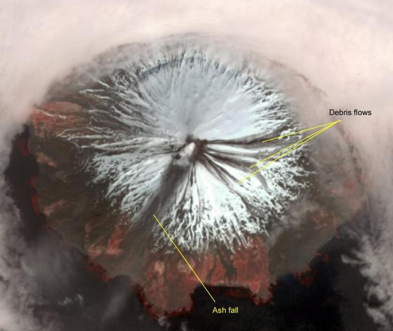 Top left: A cropped ASTER image of Cleveland volcano taken in May 2010 showing a weak plume and debris flows on the volcanoes steep slopes. Image by the NASA/GSFC/METI/ERSDAC/JAROS, and U.S./Japan ASTER Science Team and courtesy of AVO. Click on the image to see a larger version.