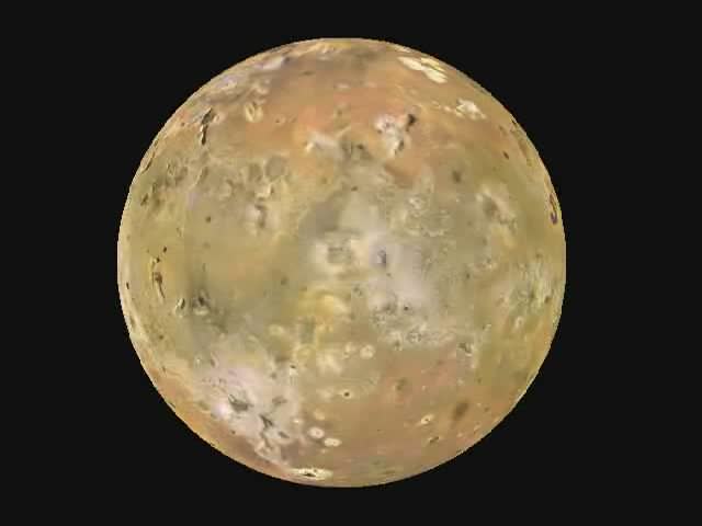 Top left: The volcano-scarred surface of Jupiter’s moon Io.