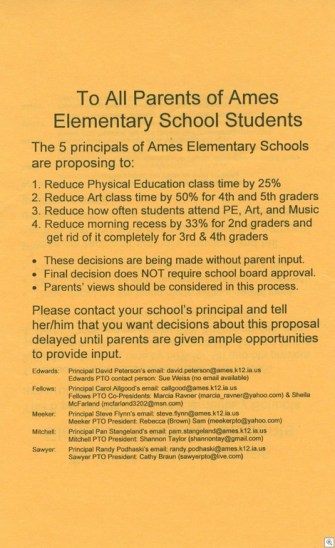 There are both pros and cons to the changes. My kids’ elementary school has a phenomenal art teacher and we’re not too keen on our kids seeing her less often. And, of course, regular physical activity is important too, particularly given the growing problem of childhood obesity. On the other hand, I’ve seen firsthand in many schools the benefits of having common planning periods, a greater emphasis on unified literacy instruction, flexible ability grouping, and so on. In a community like ours, where the family demographics are such that most districts would die to have the standardized test results and college attendance rates that we do, there also is a strong element of ‘the current system is working fine so why change it?’