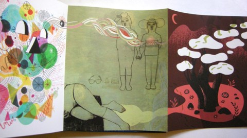 The organizers hit upon the creative idea of presenting each round as a fold-out accordion of ten pages. You pull out the gatefold and read five pages out and then five pages back. In the example above, artists Mike Perry, Camilla Engman, and Lab Partners give their take on “In the Forrest” as well as on one another. Each artist differs so radically from their neighbors, as can be plainly seen, but the topic at hand unifies them, at least in how we’re to interpret them.